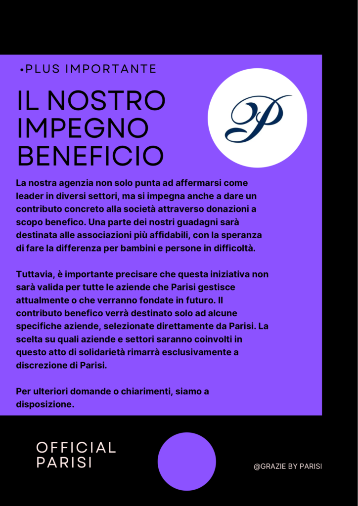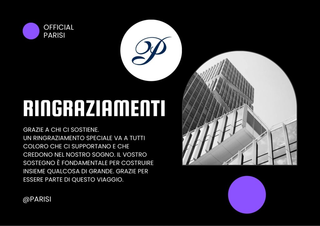 Grazie a chi ci supporta, a chi crede nei nostri sogni e ci aiuta a renderli reali. Parisi è un’agenzia con grandi ambizioni: vogliamo entrare in tanti settori, fare la differenza e puntare sempre più in alto. Continueremo a lavorare con costanza per far sì che questo progetto diventi straordinario. Il vostro sostegno è la nostra forza! 💪